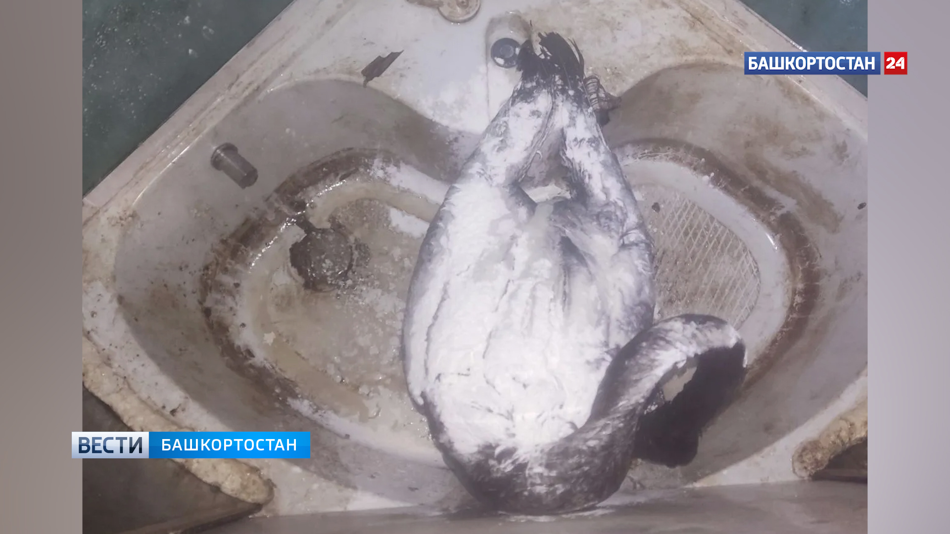На промышленной зоне в Черниковке в Уфе был обнаружен лебедь, который полностью испачкался в нефти.
